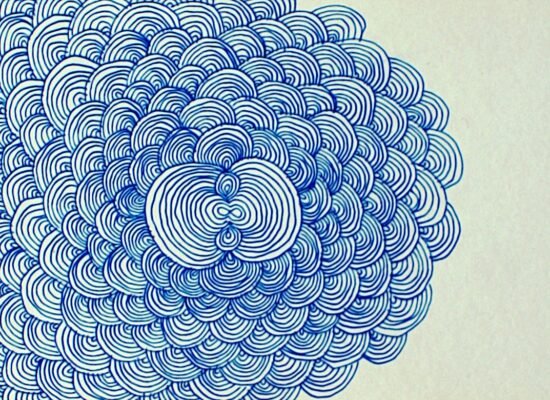 Die Wiederholung der immer gleichen Form in unterschiedlicher Größe, die Iterationen, wie es die Künstlerin nennt, werden wie in den meisten ihrer Arbeiten durch explizit handzeichnerisch gesetzte kleine Differenzen einer starren, leblosen Regelmässigkeit entzogen. Die Flächenfüllung wirkt über die Grenzen der Einrahmung hinaus; das recht kleine Bild erscheint viel größer, als es in Wirklichkeit ist.