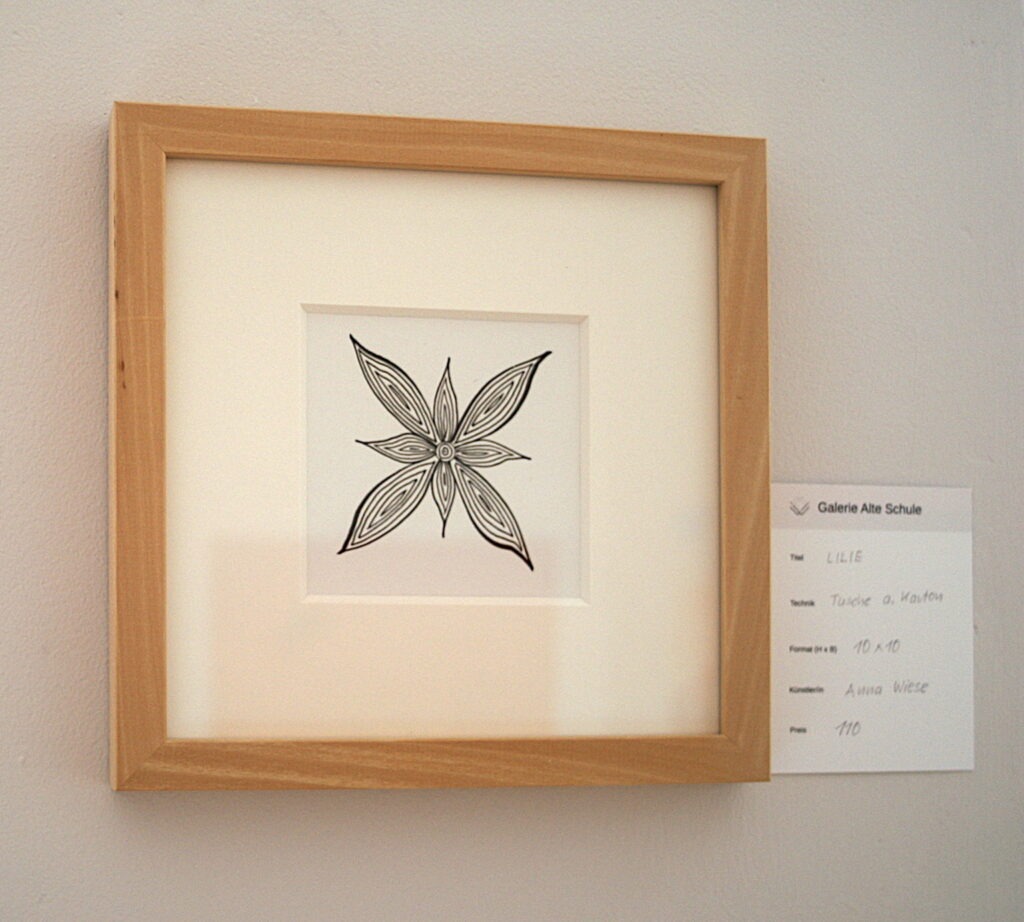 LILIE von Anna Wiese ist eine weitere und sehr schlichte Zeichnung, die perfekt auf die Bedingungen in einem quadratischen Rahmen abgestimmt zu sein scheint. Die Unmittelbarkeit der Natursymbolik ist hier mit minimalistischer Sparsamkeit wiedergegeben. Die stilisierten Blütenblätter mit ihren Unregelmäßigkeiten beleben das Bild im Zusammenspiel mit der streng geometrischen Rahmung (von der Künstlerin so gewünscht). Während tout le monde in der Kunst angeblich nichts dekoratives sehen will, legt die Künstlerin hingegen großen Wert auf dekorative Werte in ihren Arbeiten.